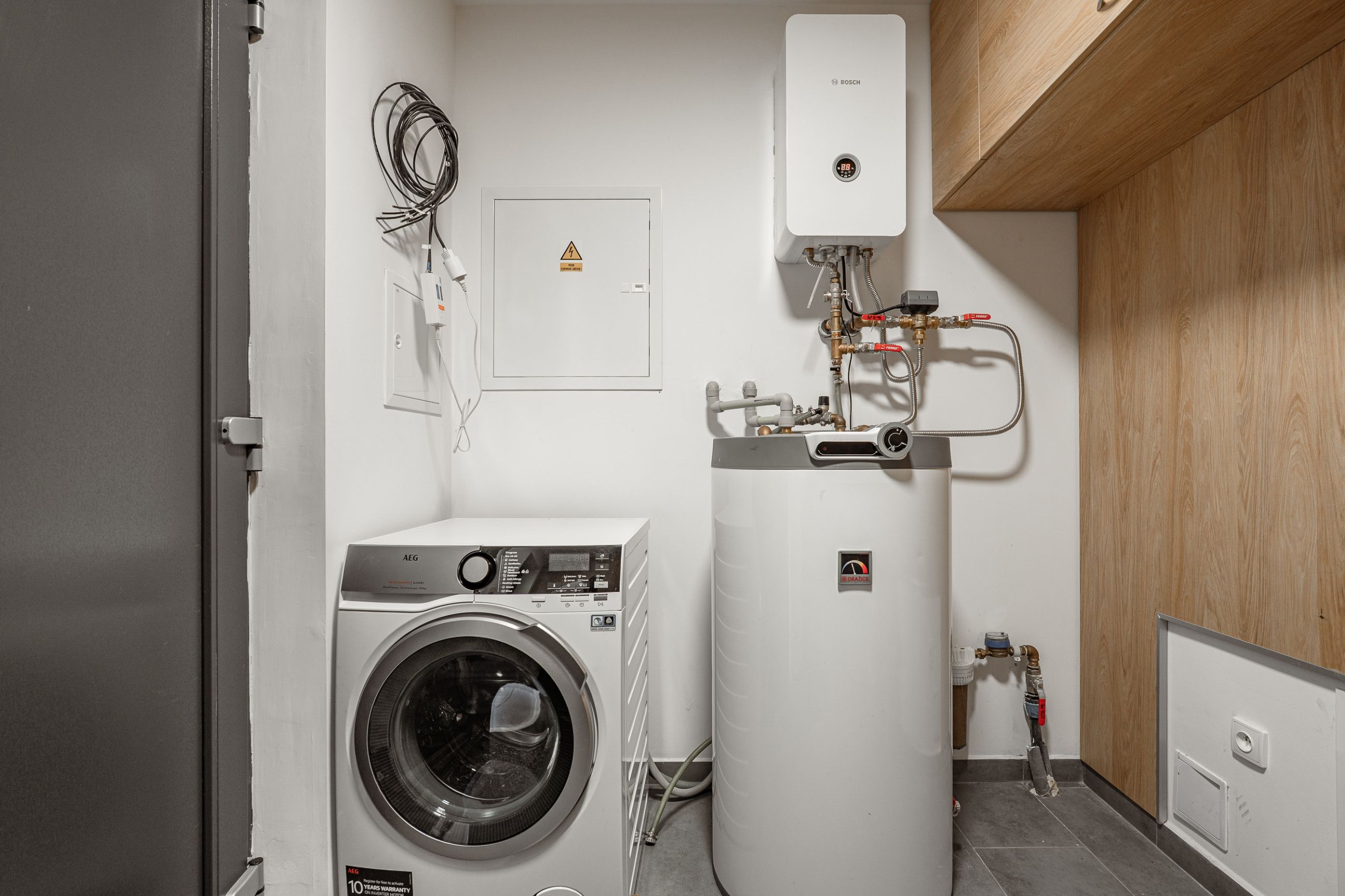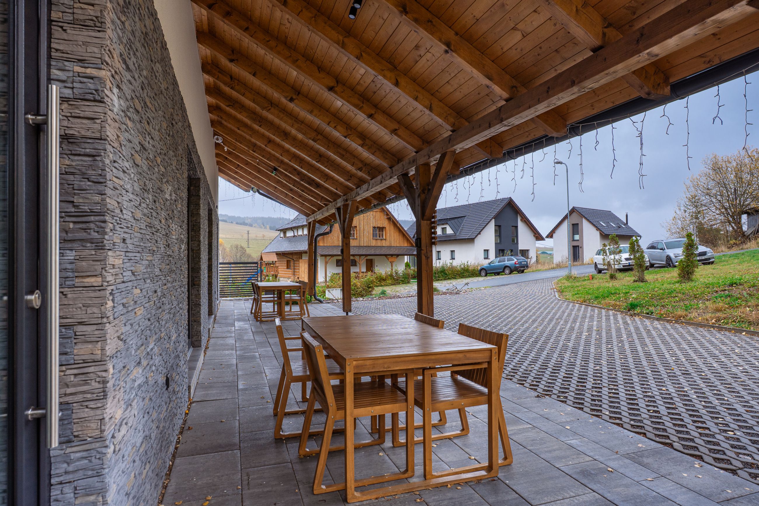 Součástí každé jednotky je samostatná technická místnost s elektrickým kotlem, bojlerem, pračkou a úložnými skříněmi. Každý apartmán má také vlastní kryté venkovní posezení pod přesahem střechy, které poskytuje příjemné soukromí i krásný výhled na okolní hory.