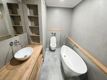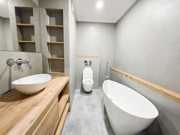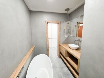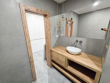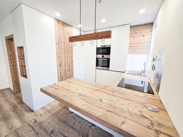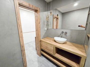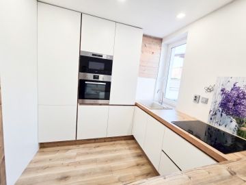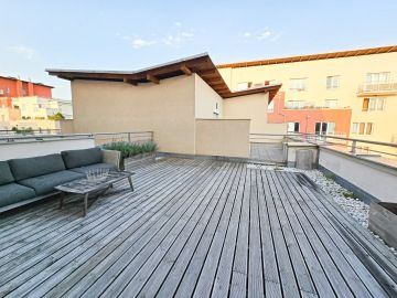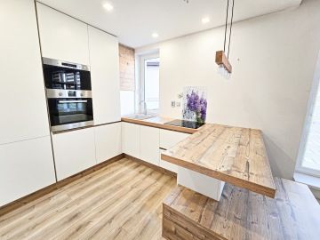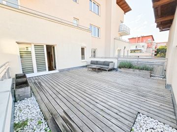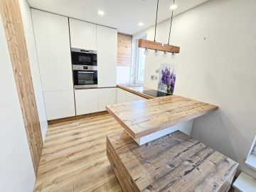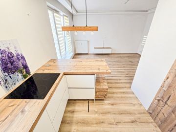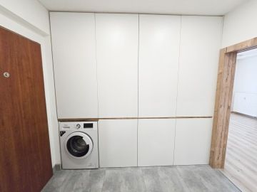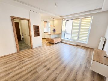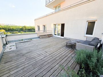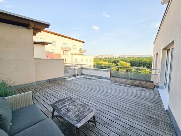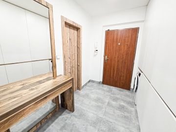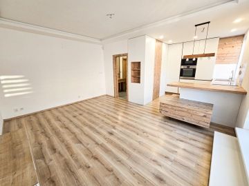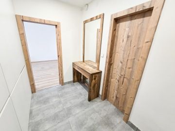 Byt prošel moderní rekonstrukcí. Dispozičně je řešen vstupní chodbou, ve které se nachází velice prostorná vestavěná skříň, kde najdeme i zabudovanou pračku. Z chodby se dostaneme do hlavní místnosti s kuchyní, která je plně vybavena spotřebiči - troubou, myčkou, lednicí. Hlavní dominantou bytu je jeho terasa o rozměrech 23 m², ze které je krásný výhled do zeleně a nabízí tak příjemné místo k posezeni, grilování a relaxaci. V koupelně se nachází volně položená desingová vana a toaleta, vše je zde laděné do přírodního dřeva. Na podlahách bytu je položena plovoucí podlaha a v koupelně a na chodbě je dlažba. K bytu náleží garážové stání. V okolí se nachází veškerá občanská vybavenost.